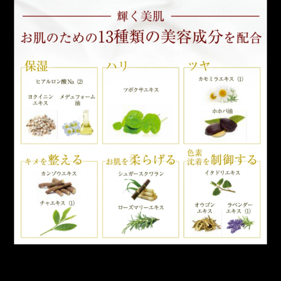 ※安全性を確認した製品においてもすべての方にアレルギーや皮ふ刺激が起きない、また、ニキビができないわけではありません。